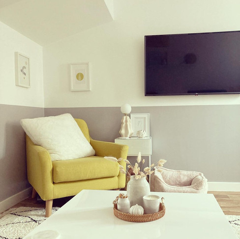 Editors note - The owners have carefully curated their home. Neutral throughout with on-trend decor. I love the use of different pampas grasses in stylish vases, no two are the same. The colour block on the walls gives the room different depths.